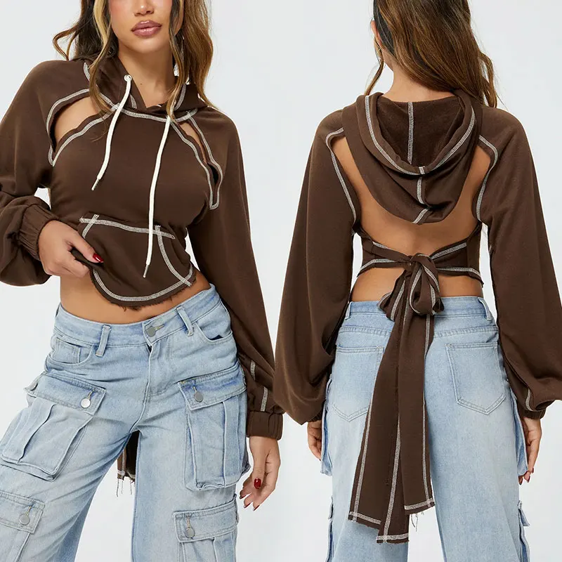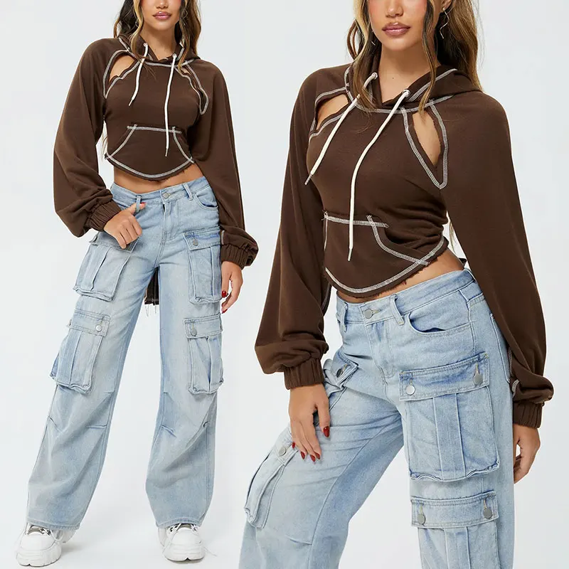 Huili Oem new trending Heavyweight 100% Cotton French Terry Women pullover cropped hooded top custom logo y2k cutout Hoodie